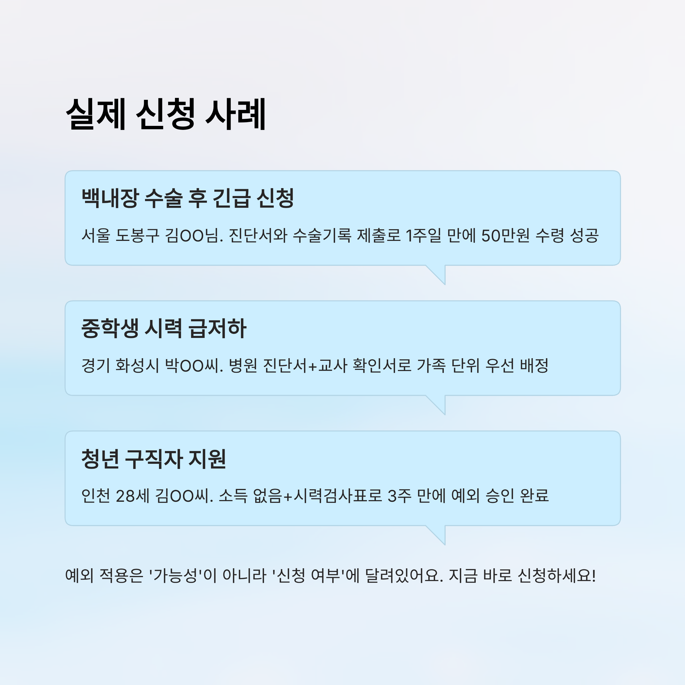 인천의 28세 남성 김OO 씨는 구직 중 시력이 급격히 나빠졌지만 소득이 없어 신청이 늦었어요. 건강보험료 납부 기록이 없고, 시력 검사표와 안과 진단서를 함께 제출해 예외 승인을 받아 3주 만에 지원 완료!