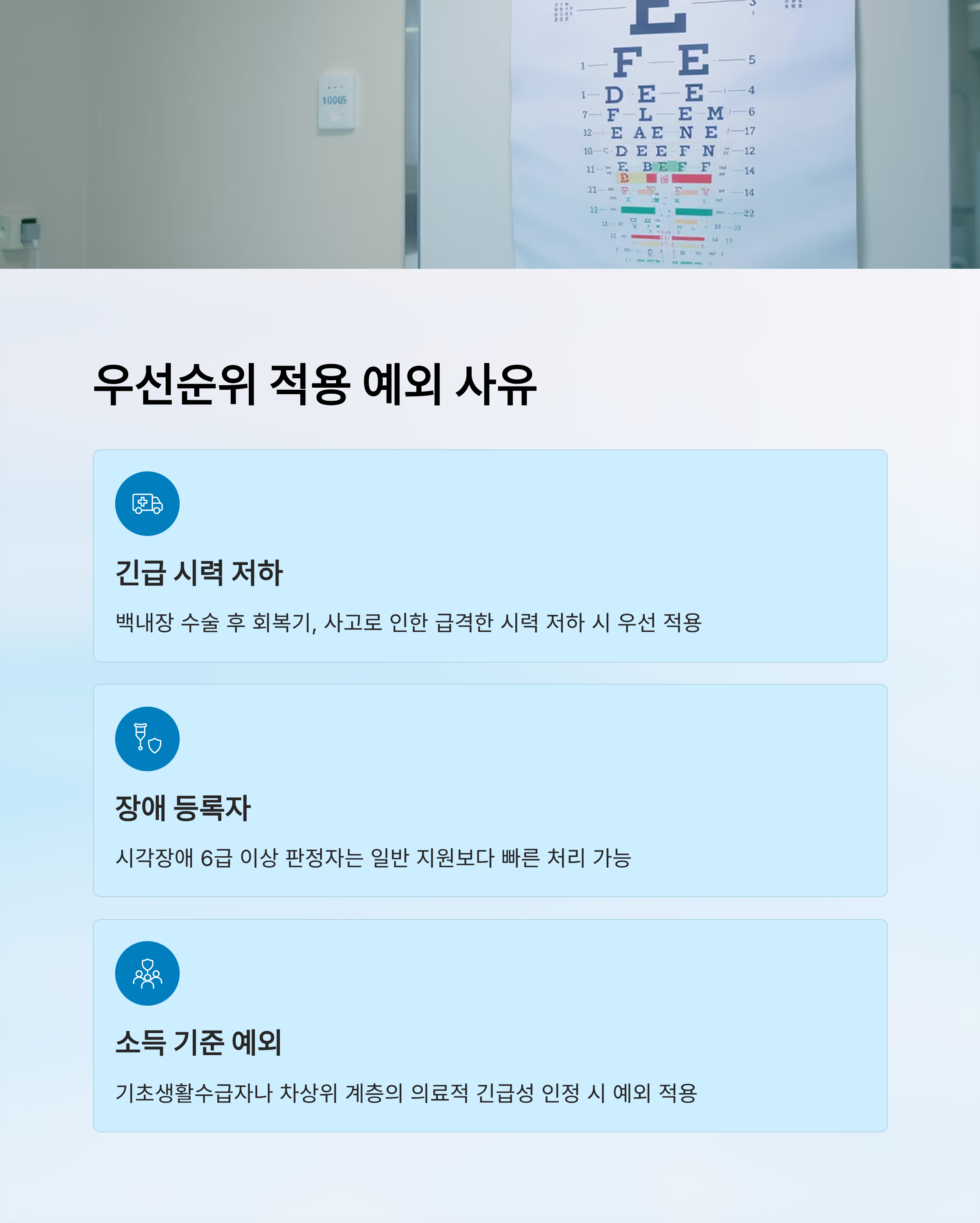 가장 대표적인 예외 사유는 ‘긴급한 시력 교정이 필요한 경우’예요. 예를 들어 백내장 수술 후 회복기이거나, 사고로 인해 시력이 급격히 저하된 경우 등은 우선적으로 고려돼요. 이건 생계와 직결되기 때문에 빠르게 처리되는 경우가 많답니다.