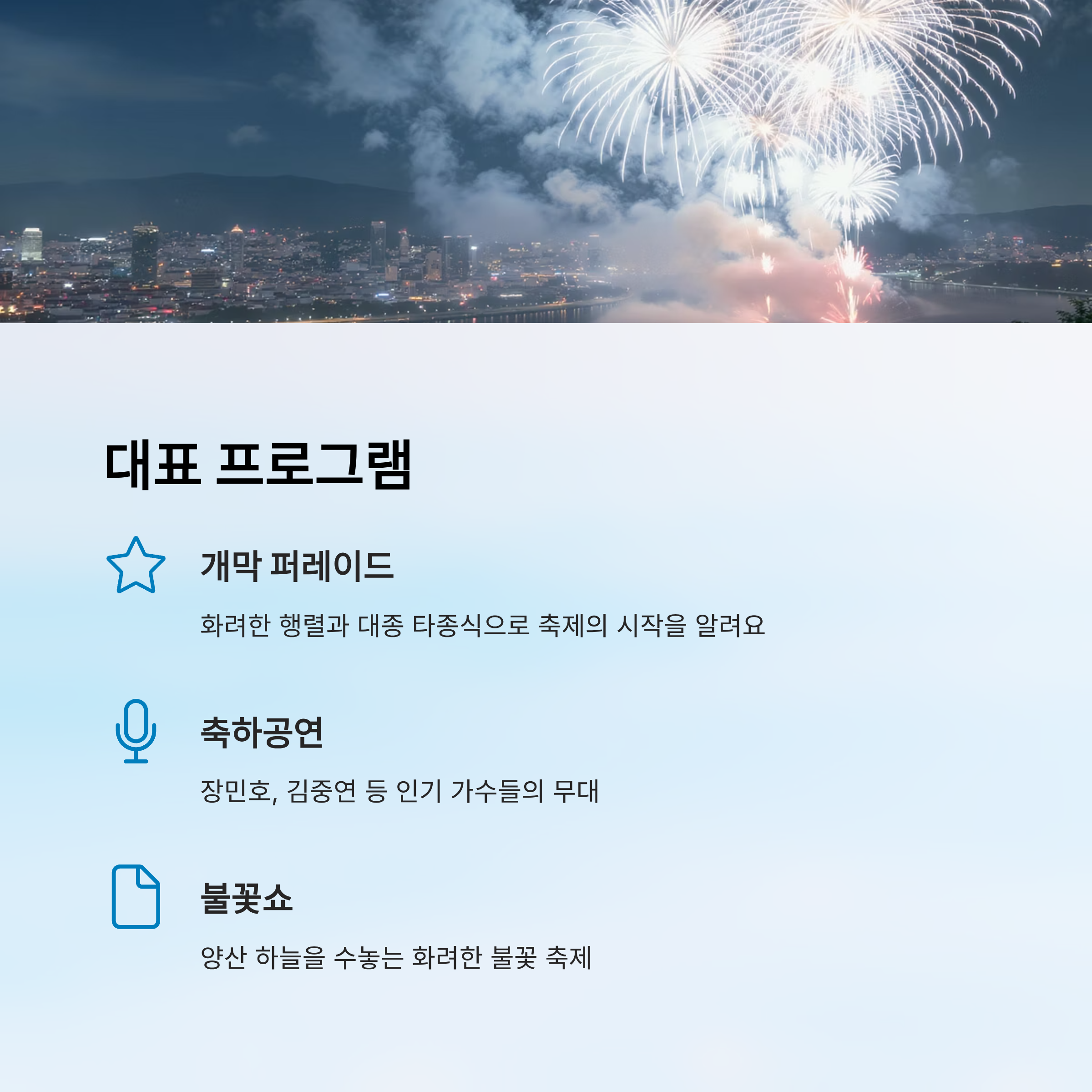 | 불꽃쇼 | 양산 하늘을 밝히는 불꽃 | 가족·연인 인기 코스 |