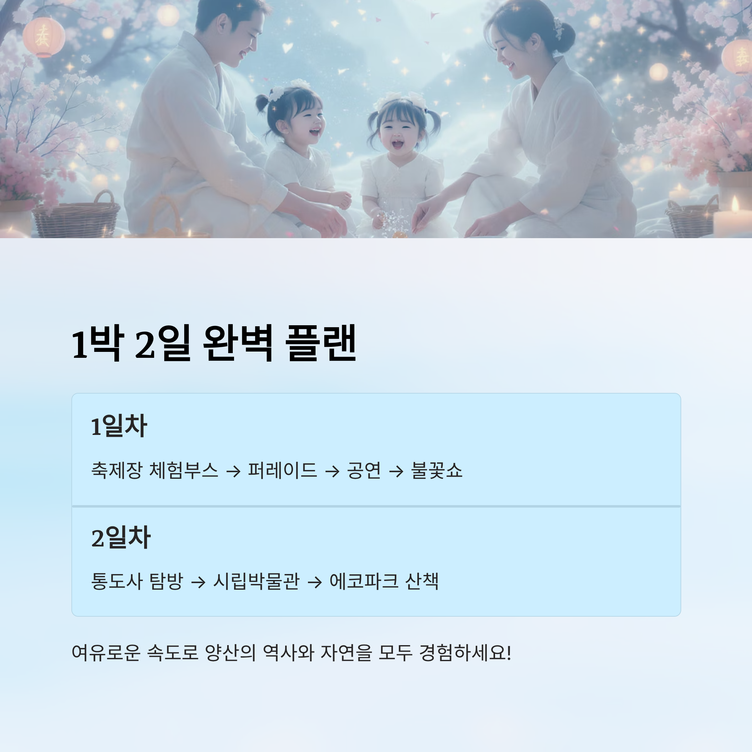 축제를 조금 더 깊이 즐기고 싶다면 1박 2일 코스를 추천해요. 당일치기로는 다 담기 힘든 양산의 역사와 자연, 먹거리를 여유 있게 경험할 수 있어요. 특히 축제의 낮과 밤 분위기를 모두 즐기려면 숙박은 필수랍니다.