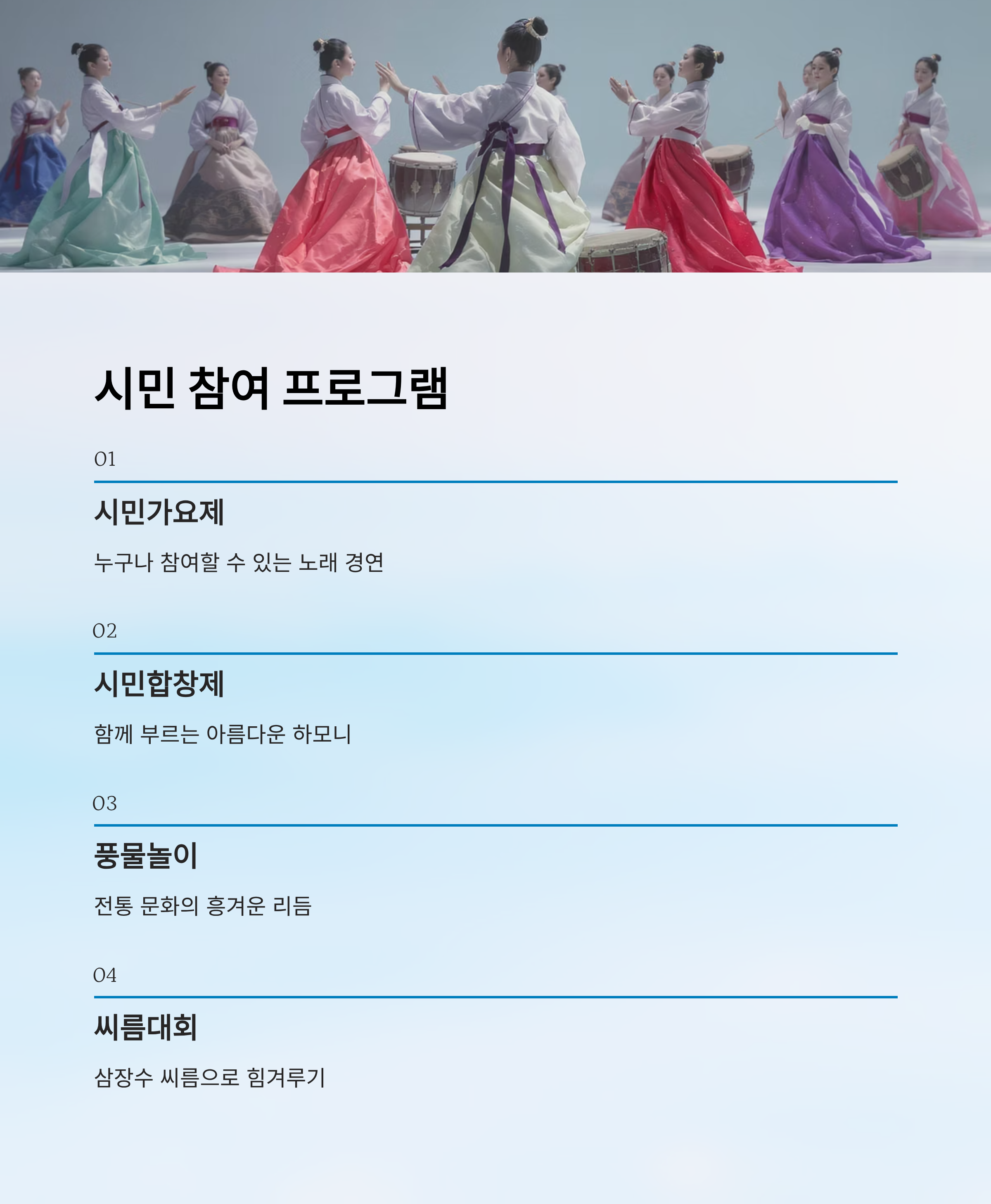 | 시민참여 무대 | 가요제, 합창, 동아리 공연 | 참여형 프로그램 |