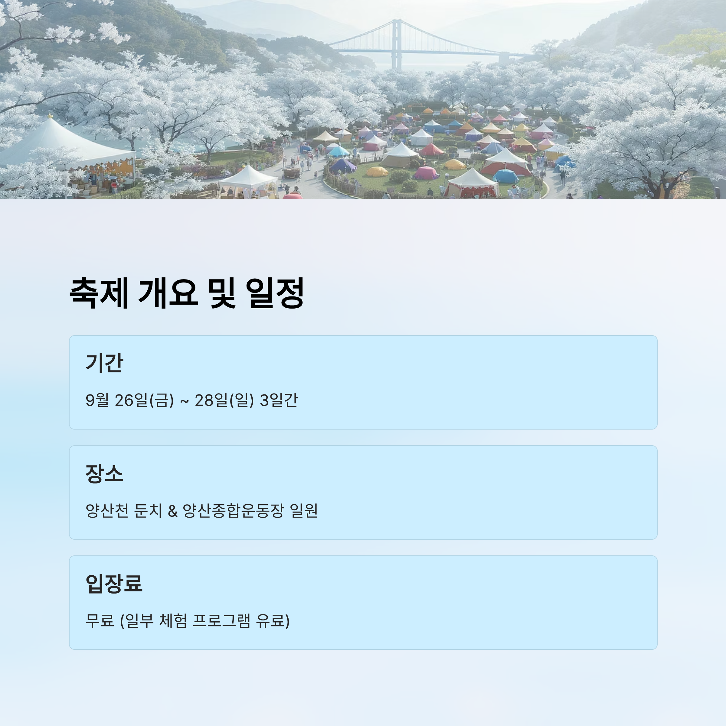 | 9월 27일(토) | 시민가요제, 전통공연, 체험부스, 풍물놀이 | 양산종합운동장 & 둔치 부스존 |