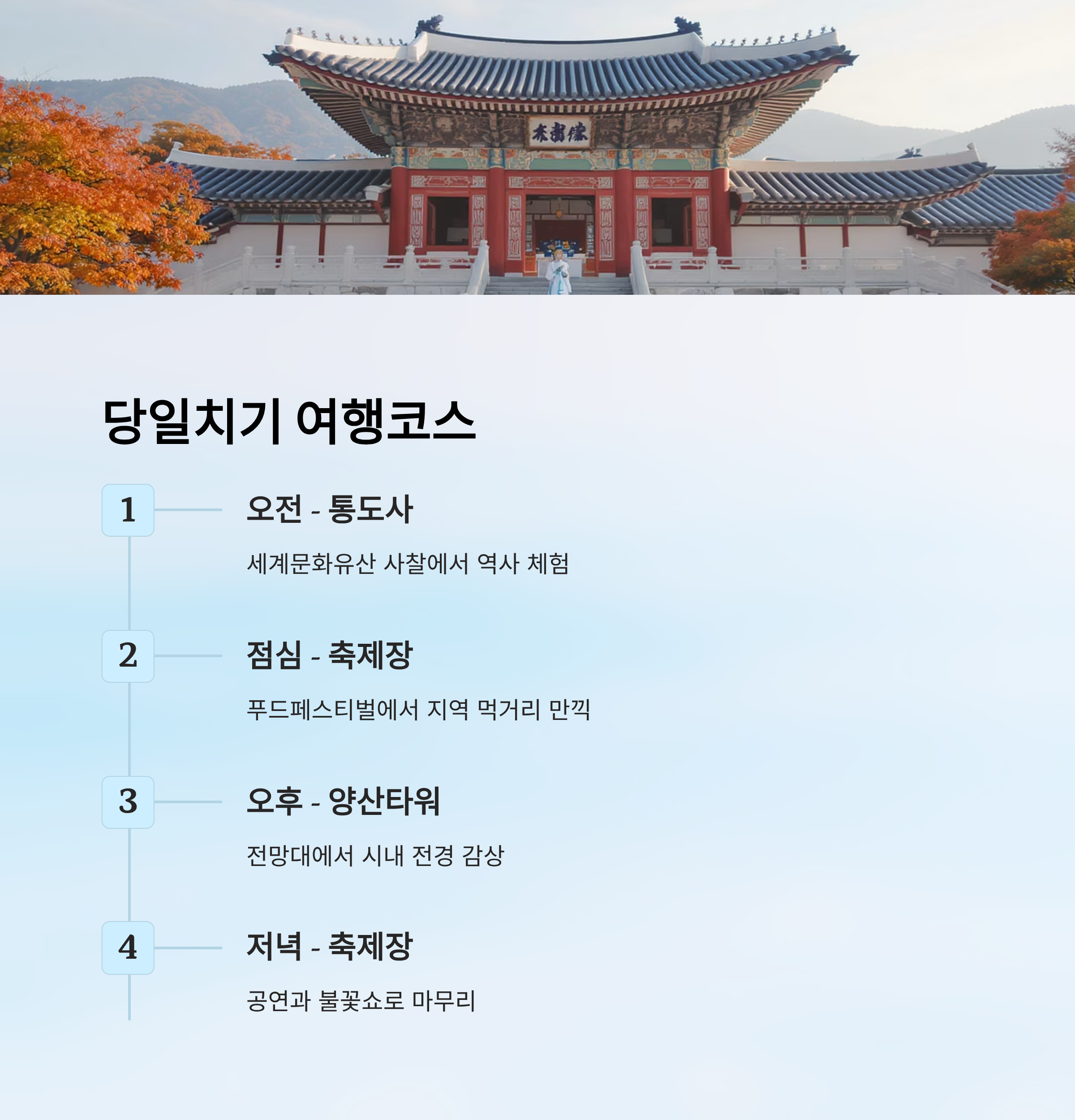 이 플랜은 축제를 중심에 두고, 양산의 대표 명소를 함께 경험할 수 있도록 구성했어요. 여유로운 속도로 둘러볼 수 있어 피곤하지 않고, 아이들과 함께하는 가족 여행객이나 연인 여행에도 적합해요. 숙소를 행사장 가까이에 잡으면 동선이 간편해지고, 저녁 불꽃쇼 후 바로 이동할 수 있어 훨씬 편리하답니다.