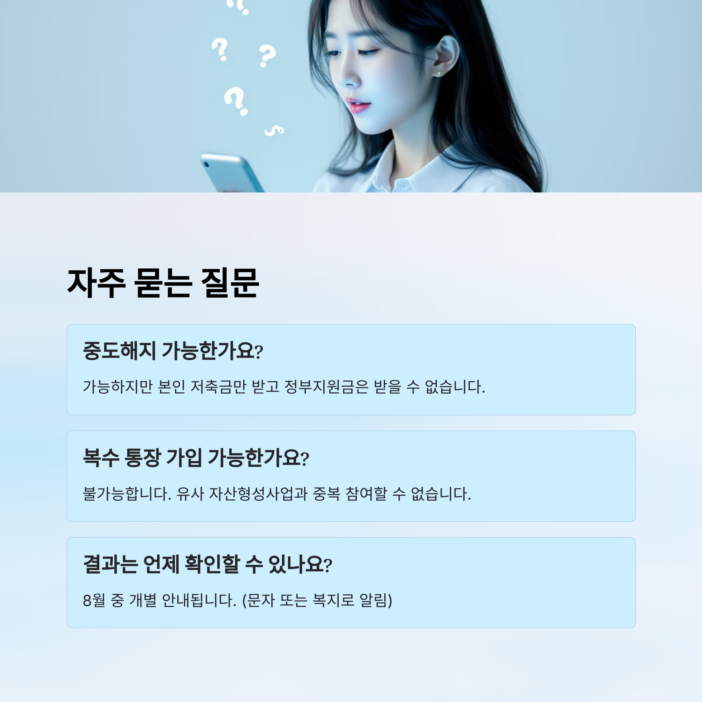 A5. 아니요. 청년내일저축계좌, 희망키움통장 등 유사 자산형성사업과는 중복 참여가 불가능해요. 한 가지만 선택해야 해요.