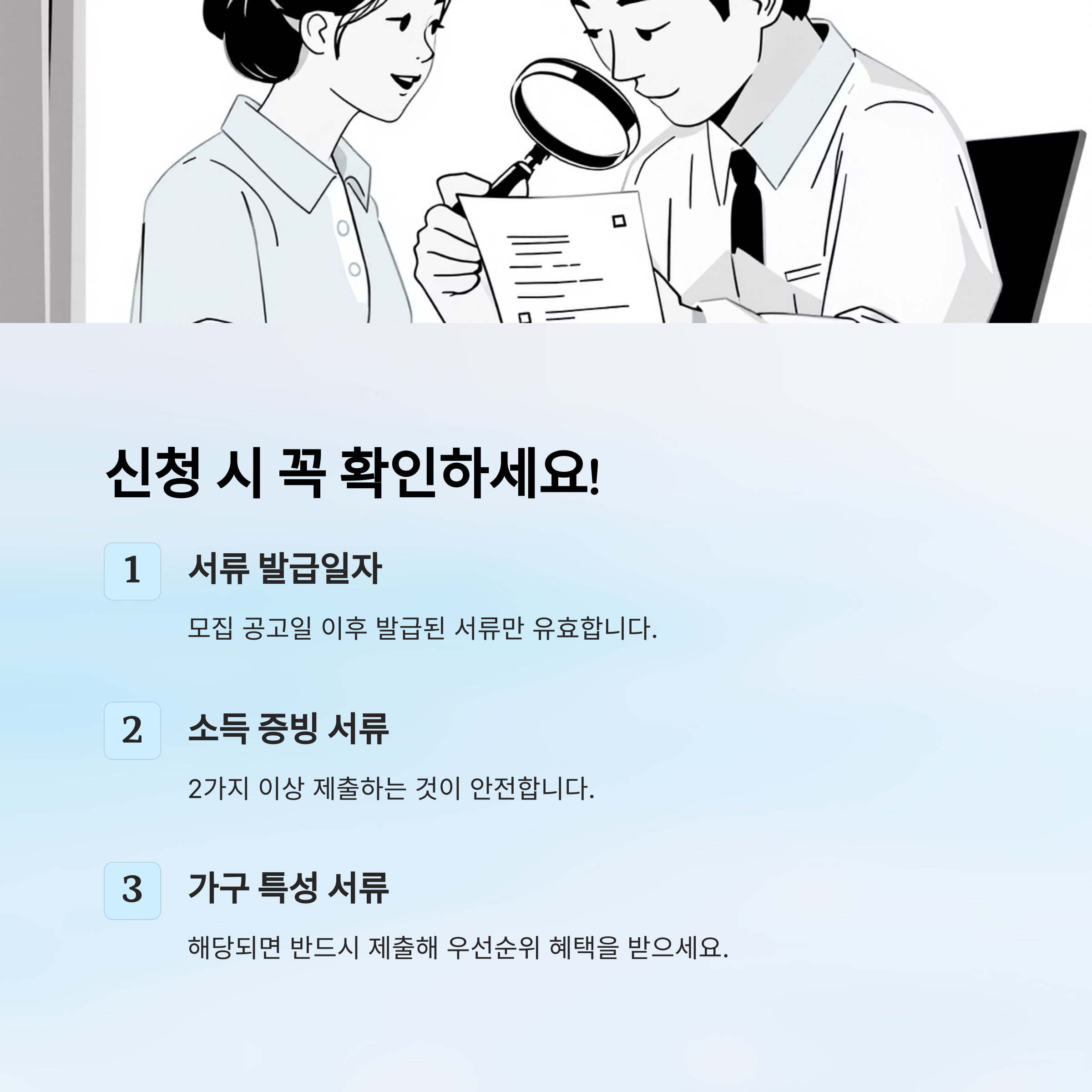 첫 번째로, **서류 발급일자**를 꼭 확인해야 해요. 모든 증명서류는 모집 공고일 이후 발급된 것만 유효하니, 예전에 발급받아둔 걸 그냥 제출하면 무효가 될 수 있어요. 서류는 최대한 접수 직전에 발급받는 게 좋아요.