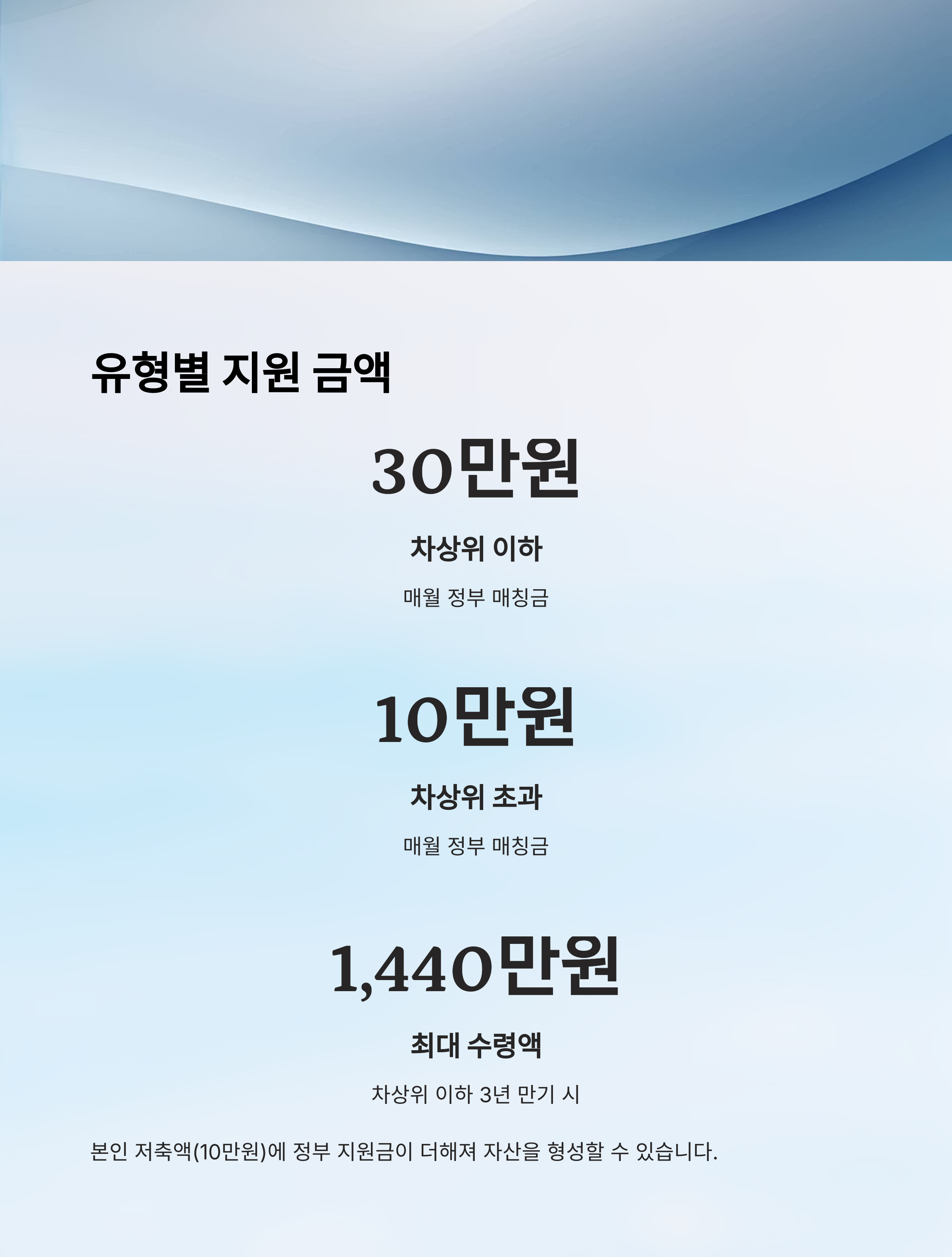 | 지원 유형 | 본인 월 저축액 | 정부 매칭금 | 3년 만기 수령액 |