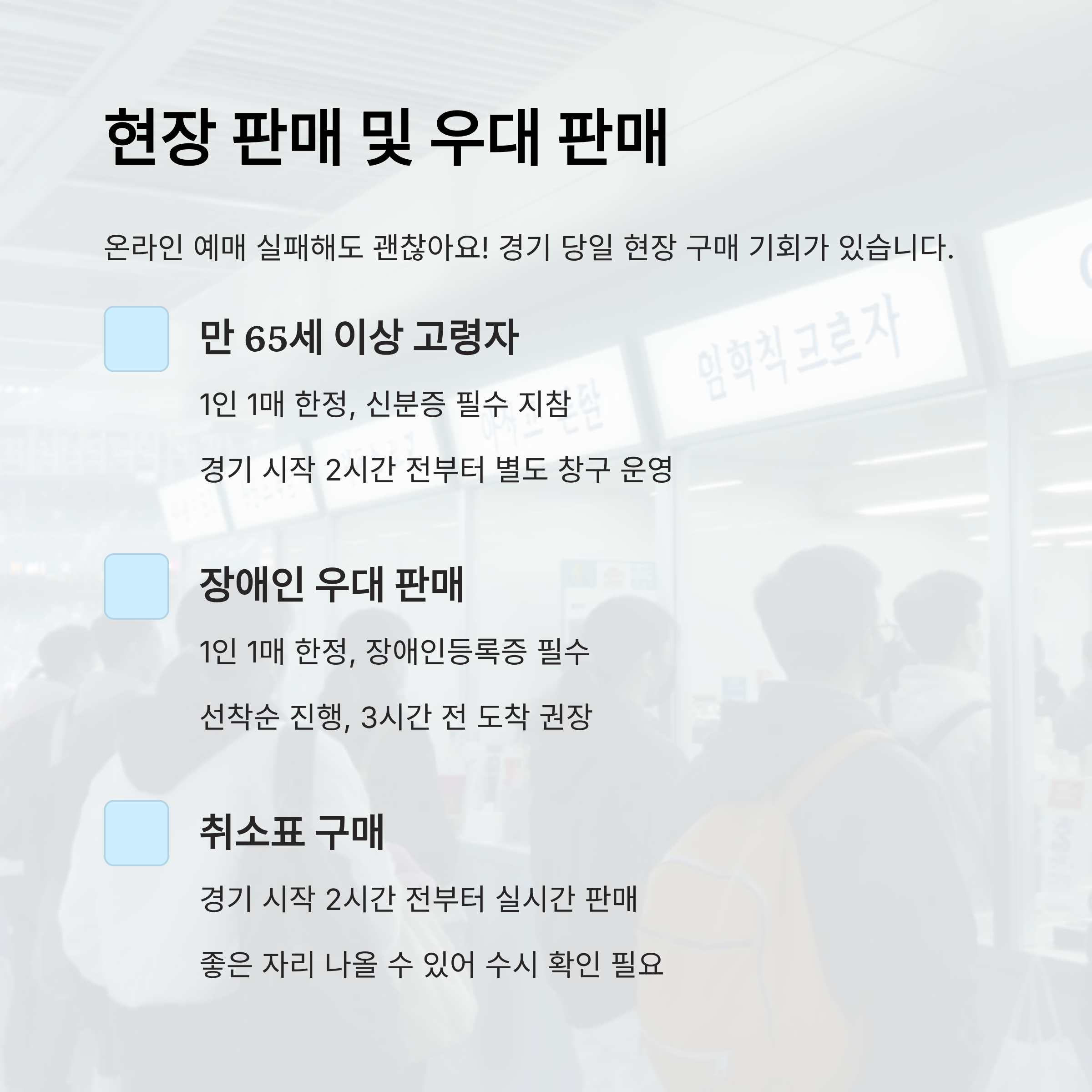 혹시 온라인 예매에 실패하셨나요? 걱정하지 마세요! 경기 당일에도 티켓을 구매할 수 있는 기회가 있어요. 바로 ‘현장 판매’와 ‘우대 대상자 전용 현장 구매’인데요. 일정 조건만 충족하면 예매 사이트보다 경쟁이 덜할 수 있어요.🤗