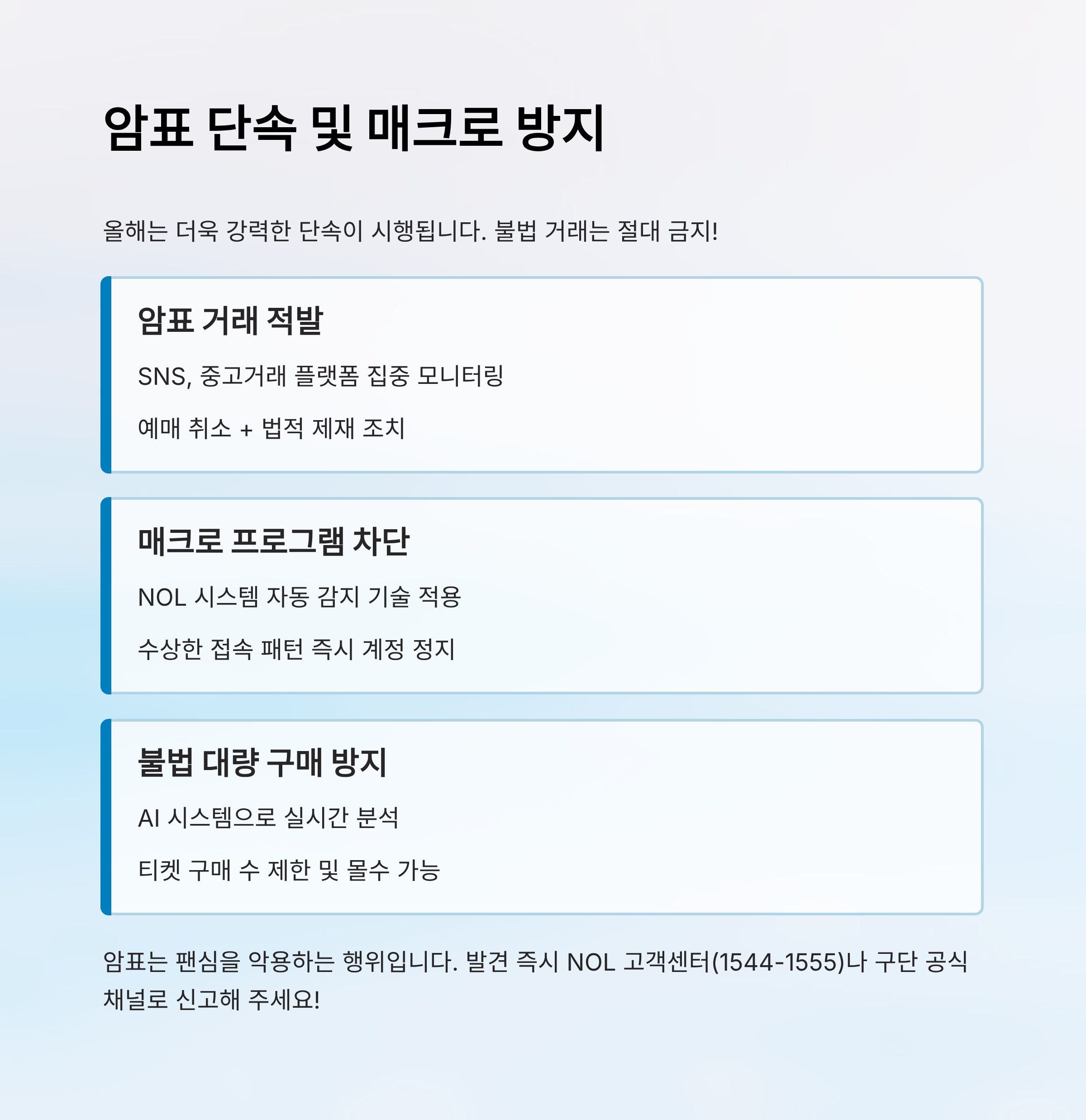 준플레이오프 티켓은 한정 수량이라 항상 치열한 예매 경쟁이 벌어져요. 이 틈을 타서 불법으로 암표를 거래하거나 매크로 프로그램을 사용하는 사례도 종종 발생하죠. 하지만 올해는 예년보다 훨씬 더 강력한 단속이 예고되어 있어요!🚫