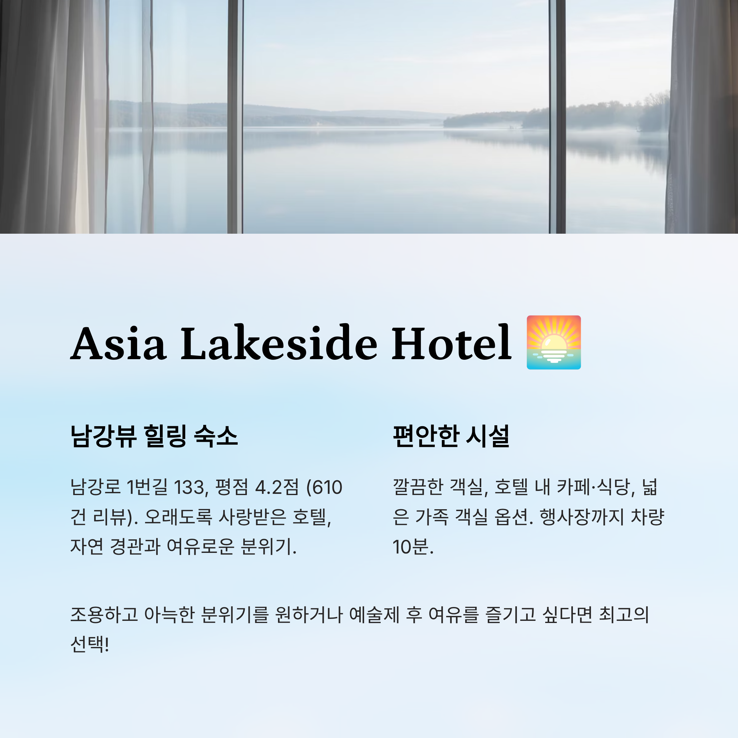 각 호텔마다 위치, 가격, 분위기, 리뷰가 조금씩 다르니 예술제 일정에 맞춰 본인 스타일에 딱 맞는 숙소를 선택해 보세요! 😊