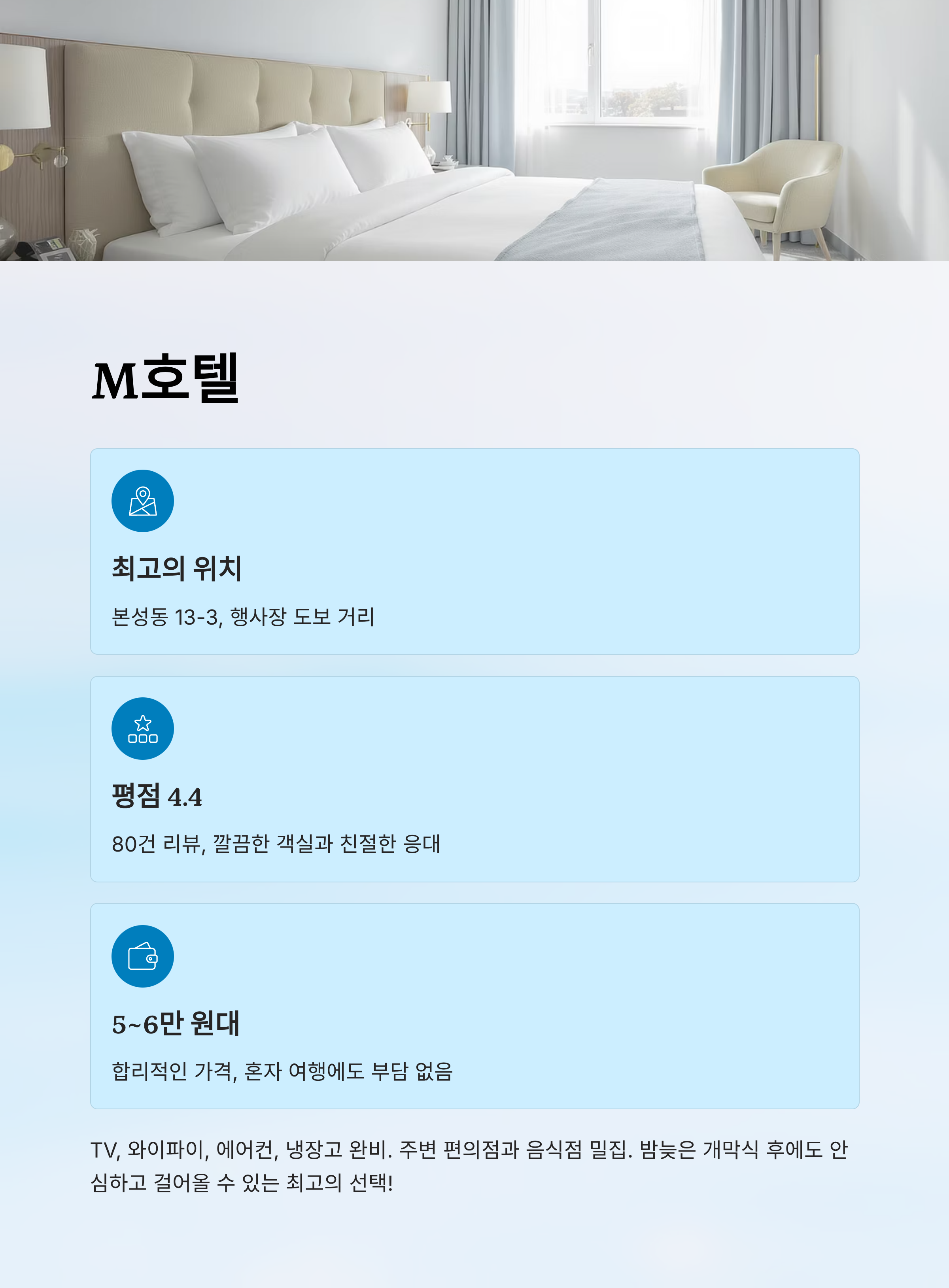 | M호텔 | 본성동 13-3 | 4.4 | 5~6만 원 | 행사장 도보, 깔끔한 객실 |