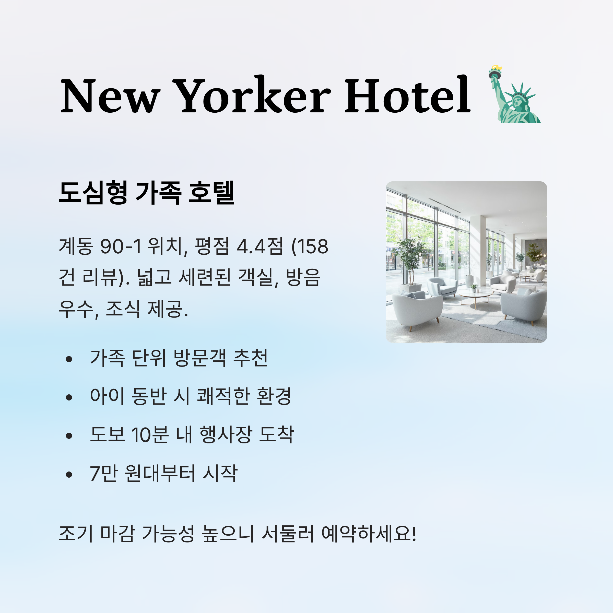New Yorker Hotel 계동 90-1 4.4 7만 원~ 가족형, 도심 위치