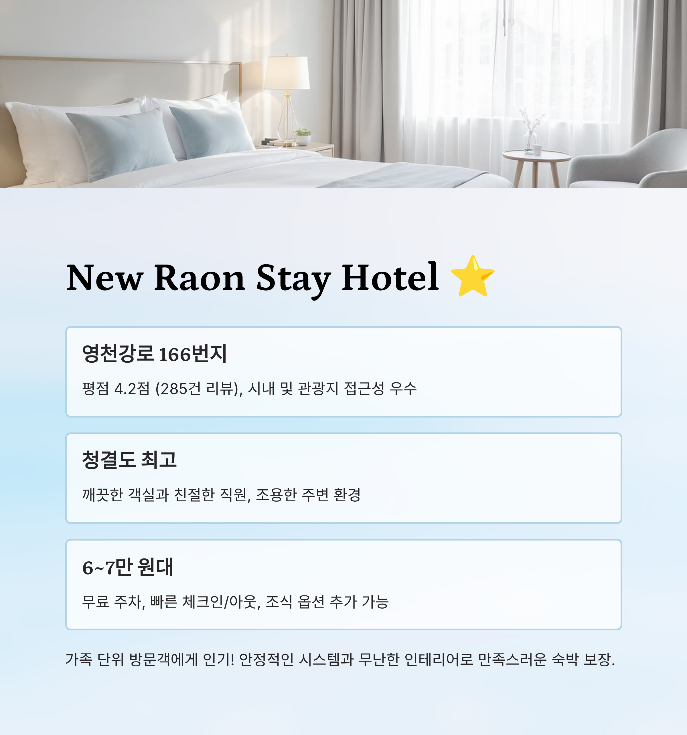| New Raon Stay Hotel | 영천강로 166 | 4.2 | 6~7만 원 | 청결 우수, 가족에 적합 |