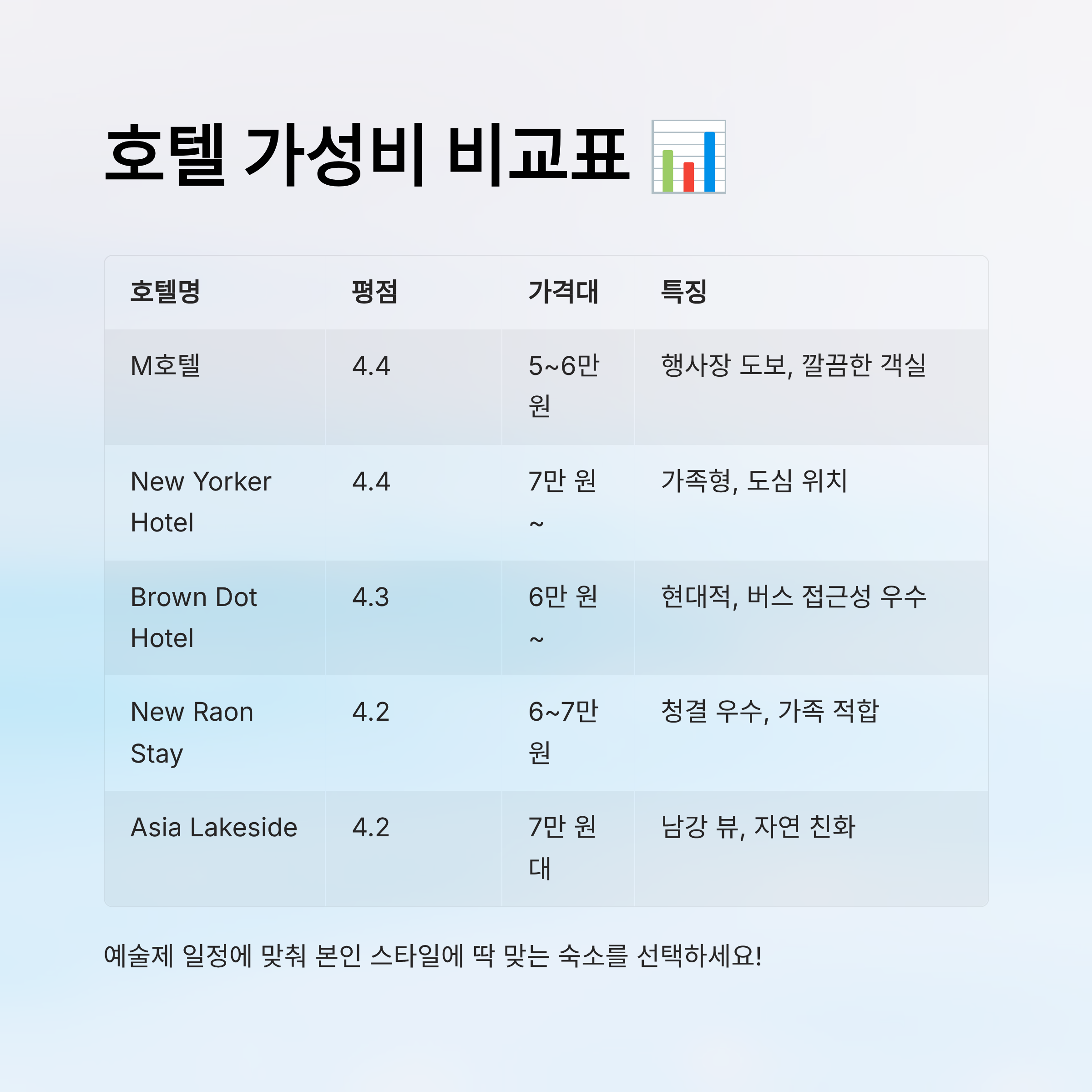 각 호텔마다 위치, 가격, 분위기, 리뷰가 조금씩 다르니 예술제 일정에 맞춰 본인 스타일에 딱 맞는 숙소를 선택해 보세요! 😊