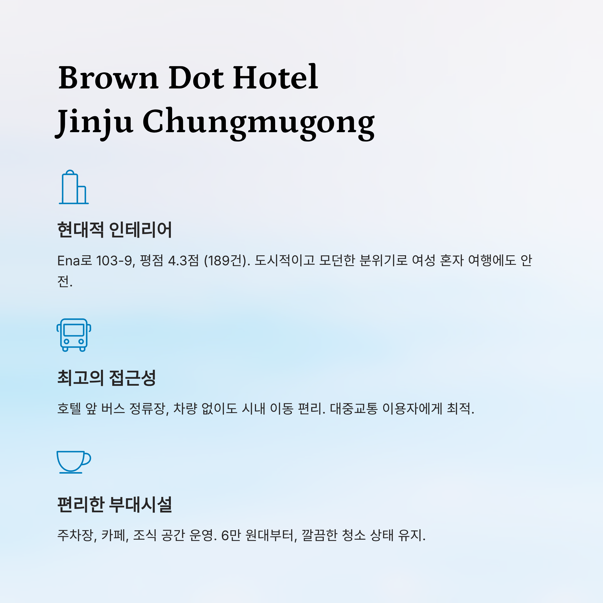 진주 Ena로 103-9에 위치한 Brown Dot Hotel은 도시적이고 현대적인 인테리어가 돋보이는 호텔이에요. 평점 4.3점(189건 리뷰)은 이용자들의 높은 만족도를 보여주죠.