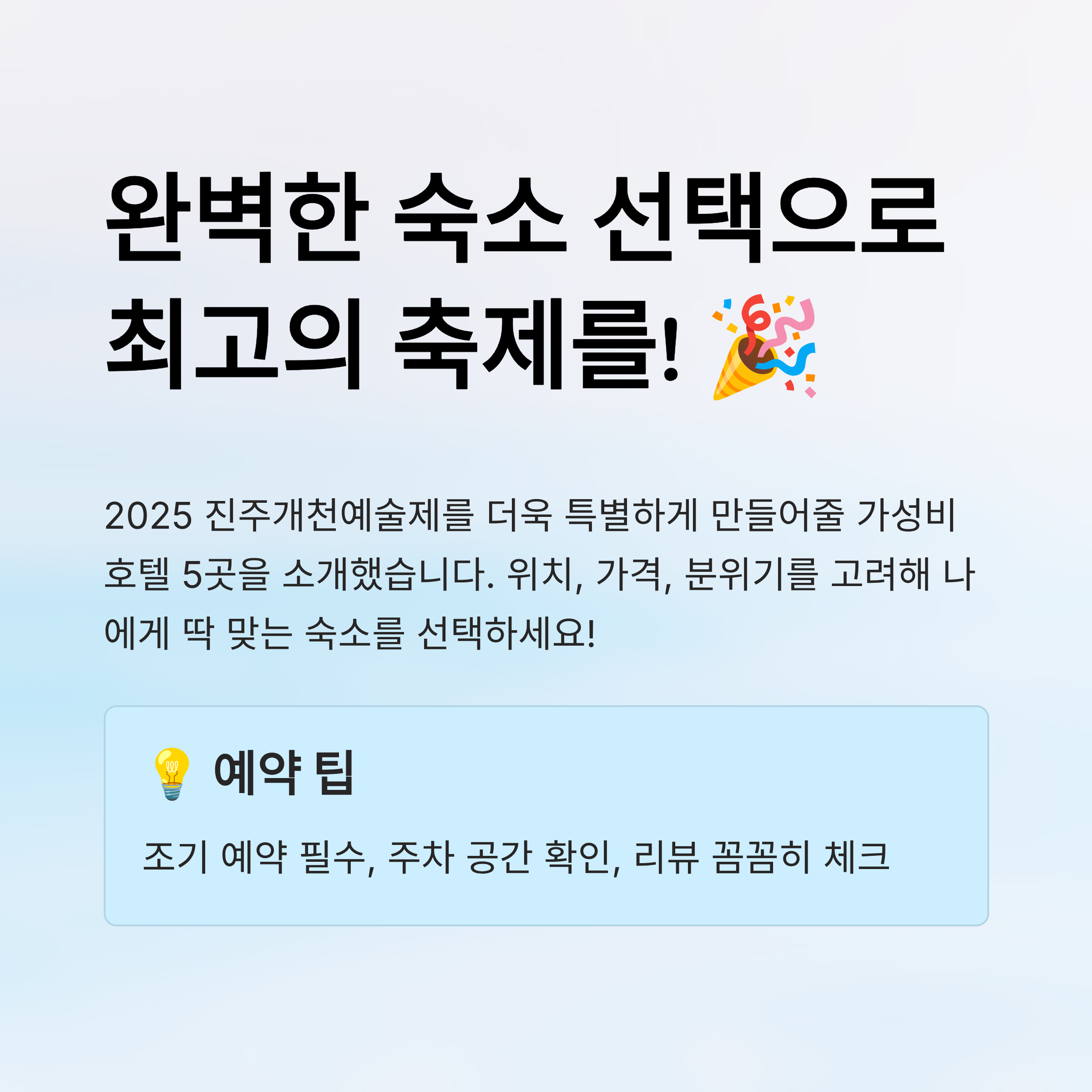 이번 글에서는 2025 진주개천예술제 행사장과 가까우면서도 가성비가 뛰어나다고 평가받는 호텔 5곳을 소개할게요. 평점, 위치, 청결도, 접근성까지 꼼꼼히 따져봤으니 가족, 친구, 커플 누구에게나 도움이 될 거예요. 👨👩👧👦