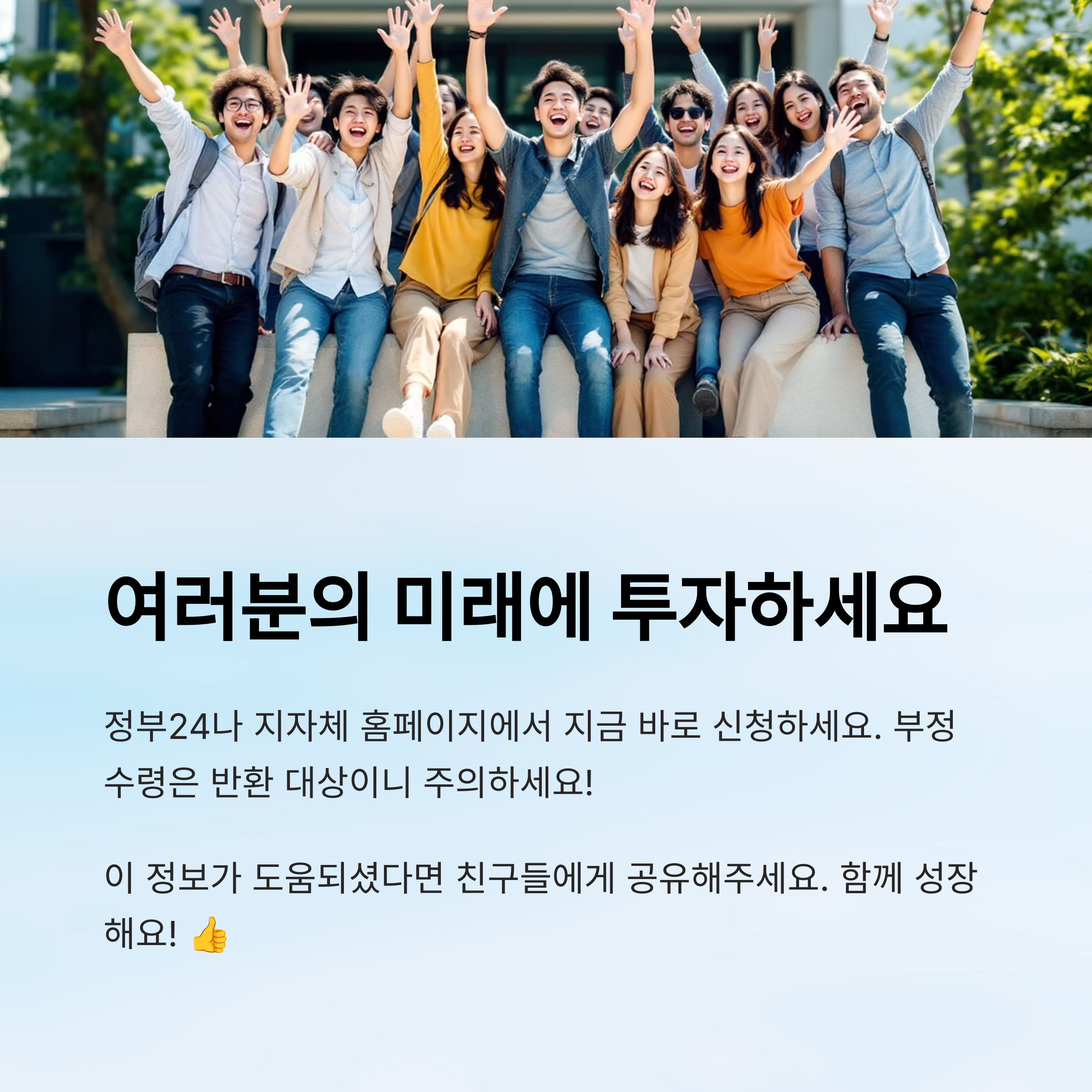 실질적인 생활비 부담을 덜어주면서도 ‘취업 성공’이라는 목적까지 함께 챙길 수 있다는 점에서 아주 알찬 정책이에요. 놓치지 말고 꼭 챙기세요! 🔥