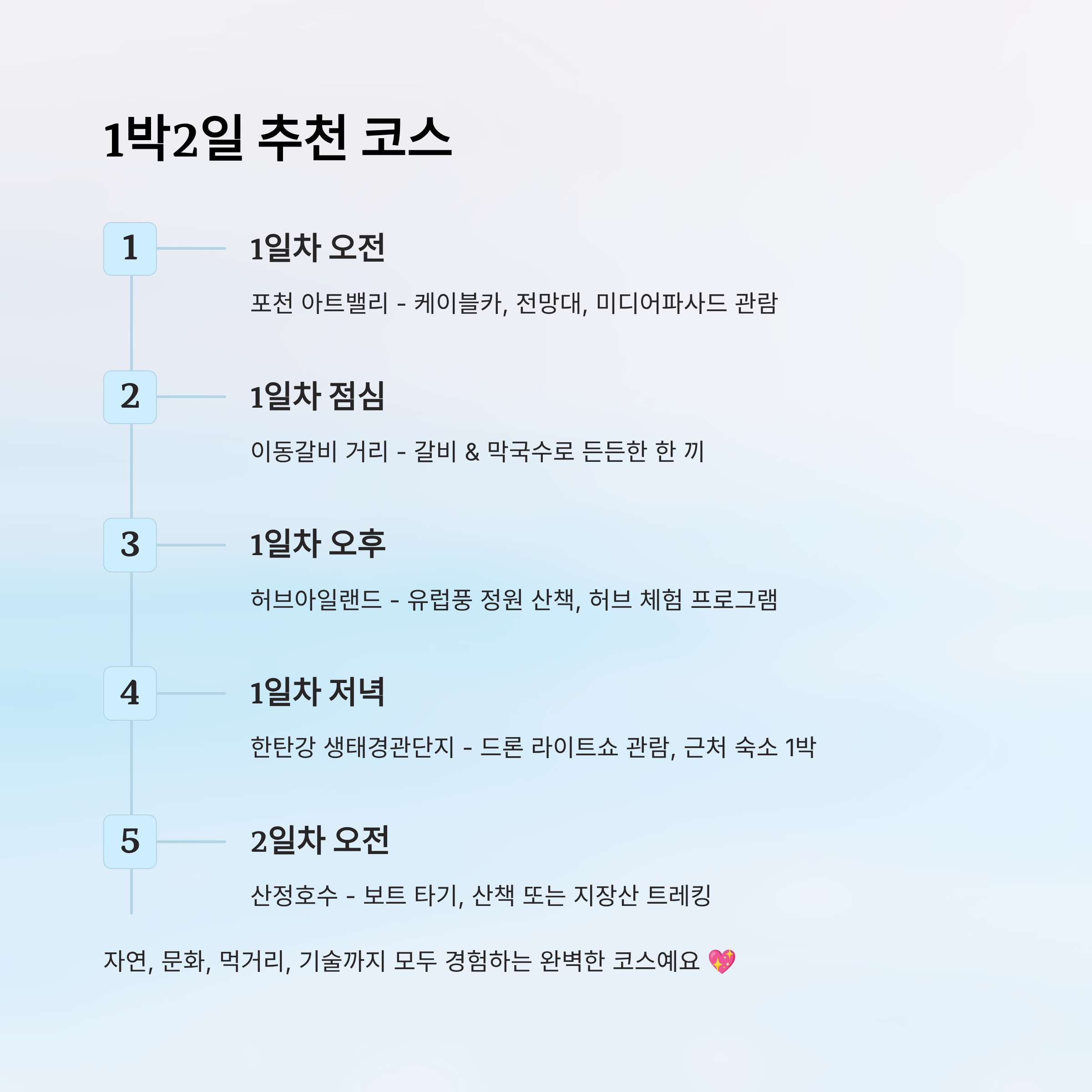 이 코스대로라면 포천의 자연, 문화, 먹거리, 기술까지 다 경험할 수 있어요. 단 하루만으로도 여행이 꽉 찬 느낌이 들고, 1박2일이면 여유롭게 힐링까지 챙길 수 있답니다. 친구, 가족, 연인 누구와 함께해도 좋은 코스예요 💖