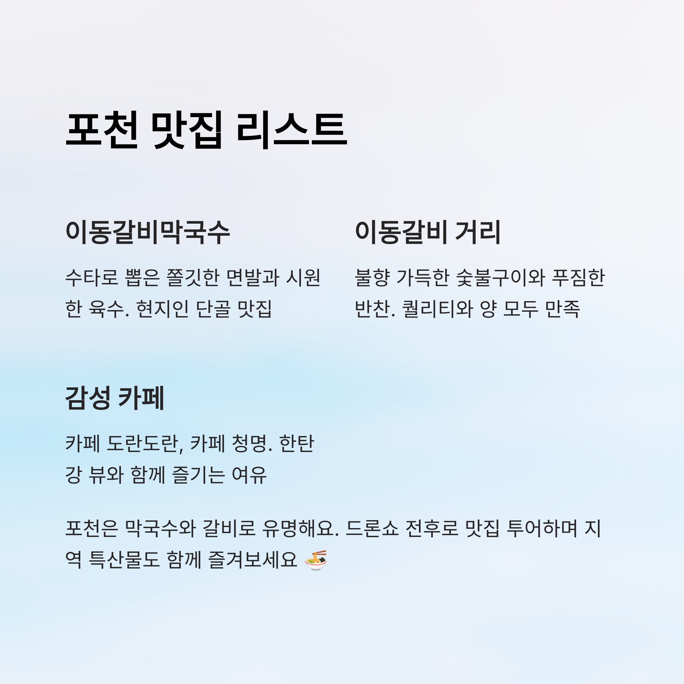 드론축제만 보고 돌아오기 아쉽다면? 포천은 자연경관, 체험, 먹거리, 힐링이 다 있는 매력적인 도시예요. 그래서 이번에는 드론축제를 중심으로 한 1박 2일 여행 코스를 짜봤어요. 친구들끼리, 커플끼리, 가족끼리 모두 만족할 수 있는 구성으로 소개할게요 😊