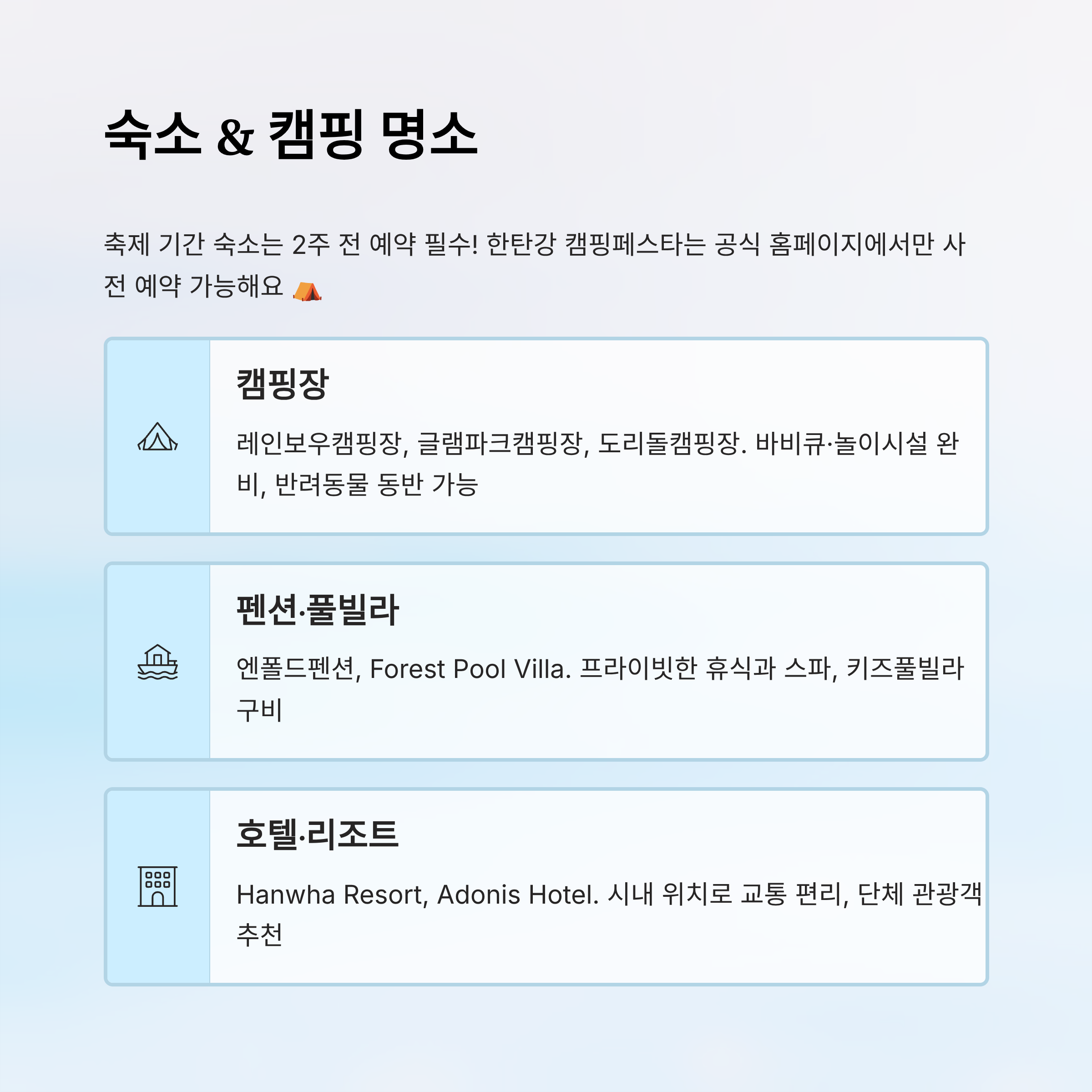 🛌 숙소 & 캠핑장 정보 요약표