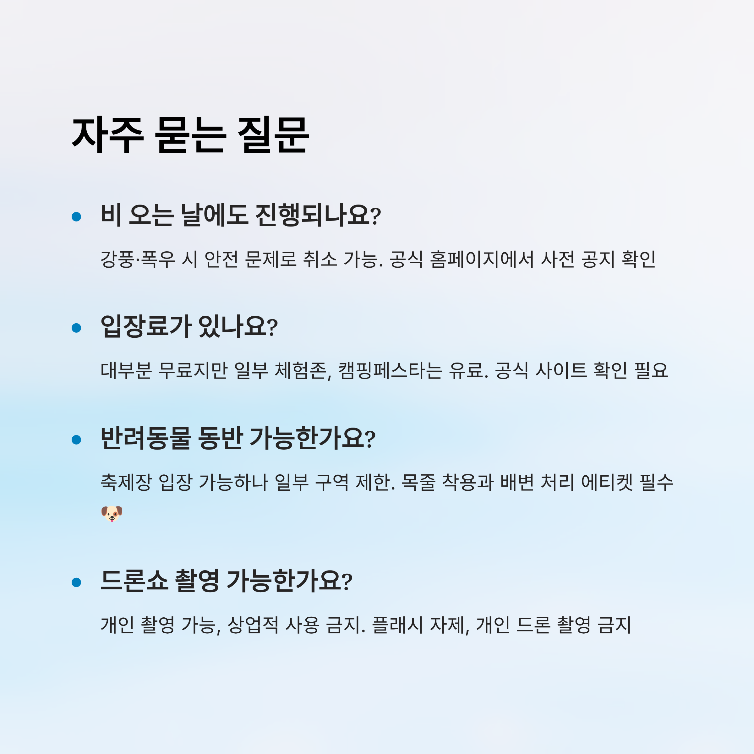 A3. 축제장 입장은 가능하지만, 드론쇼 관람 구역 등 일부 구간은 제한될 수 있어요. 안전을 위해 목줄 착용과 배변 처리 등 에티켓을 지켜주세요 🐶