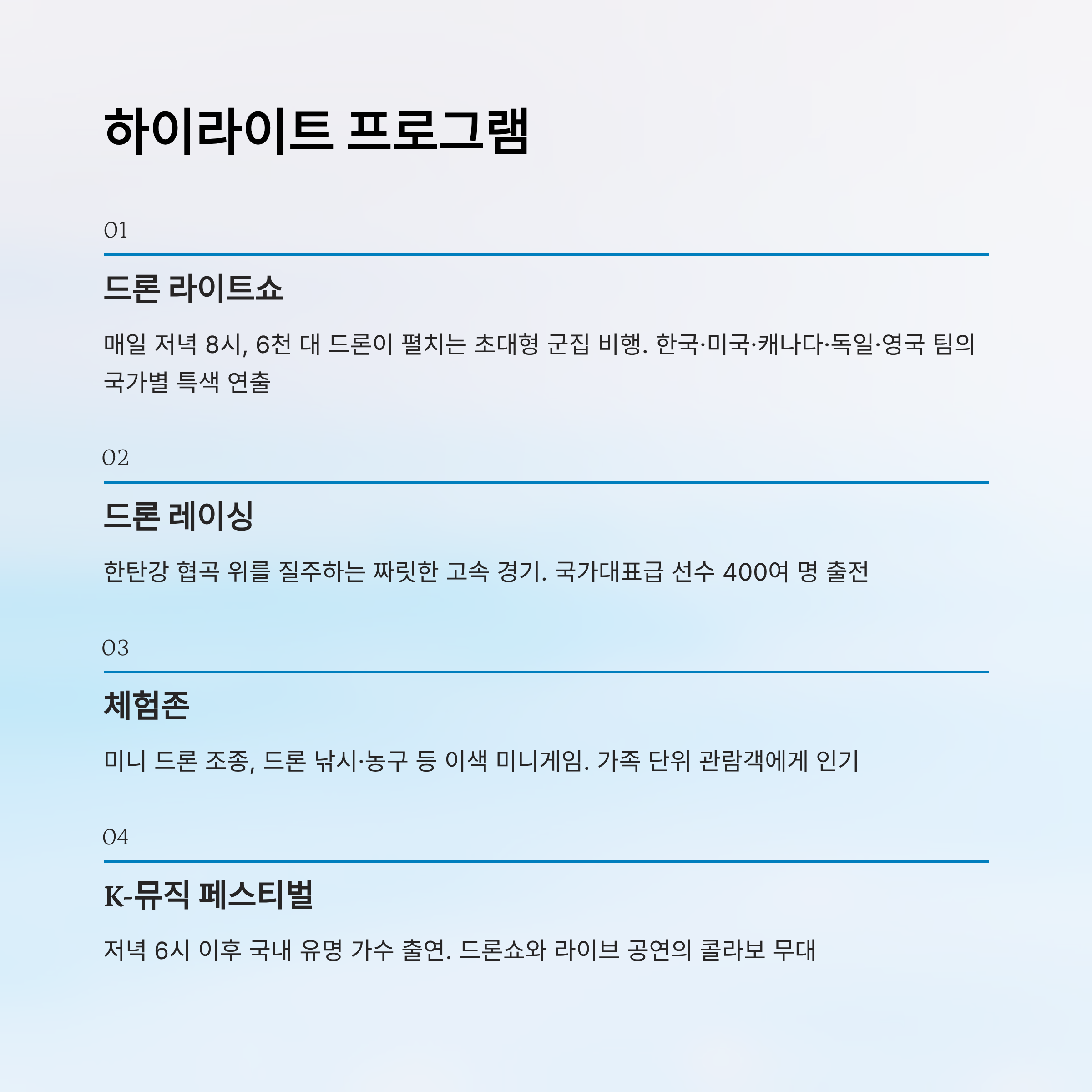| 주요 볼거리 | 드론 라이트쇼, 드론레이싱, 체험존, K-Music |