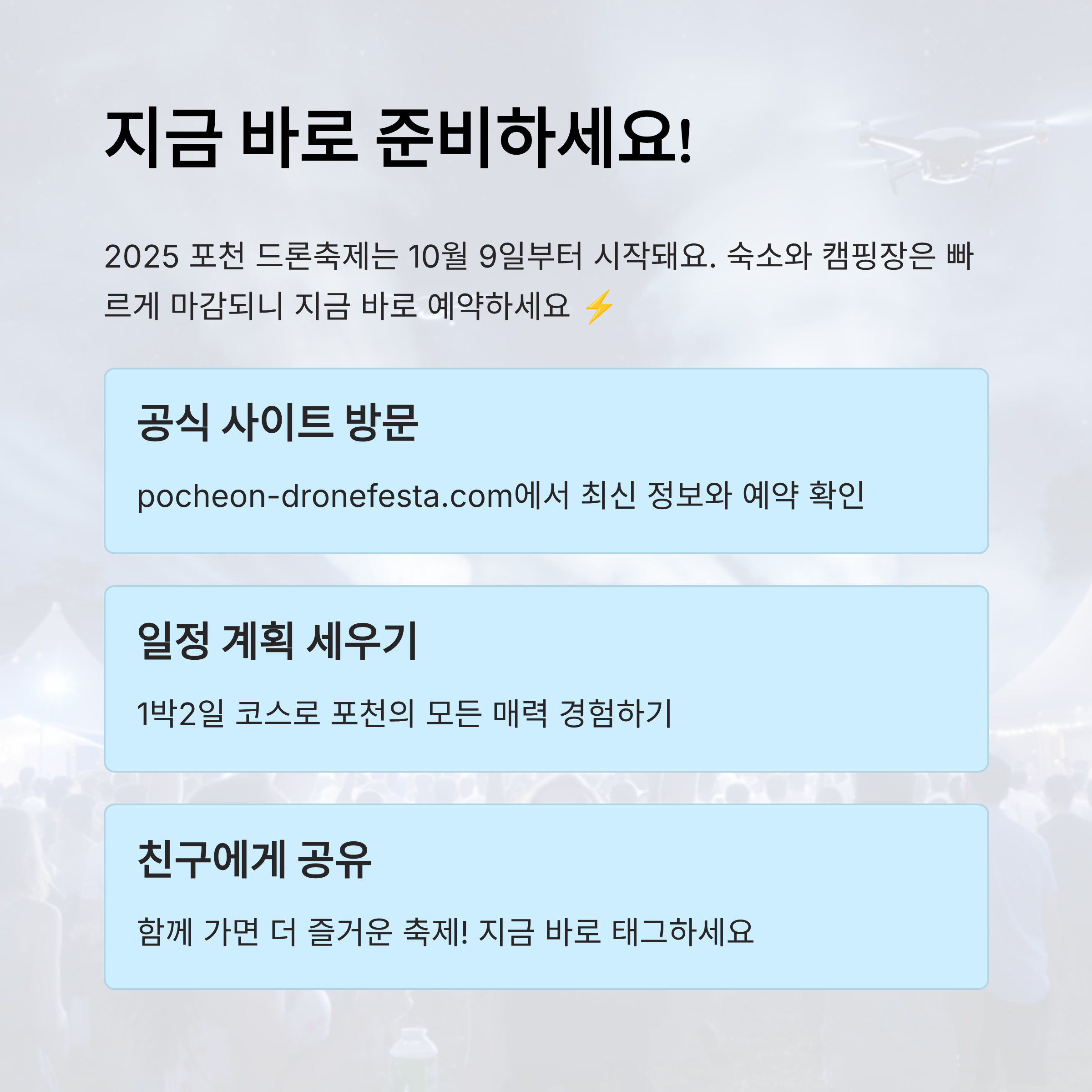 방문 전 공식 홈페이지(https://pocheon-dronefesta.com)에서 일정과 프로그램을 꼭 확인하는 게 좋아요. 특히 사전 예약제인 캠핑존은 현장 접수가 불가하니 미리 준비하세요!
