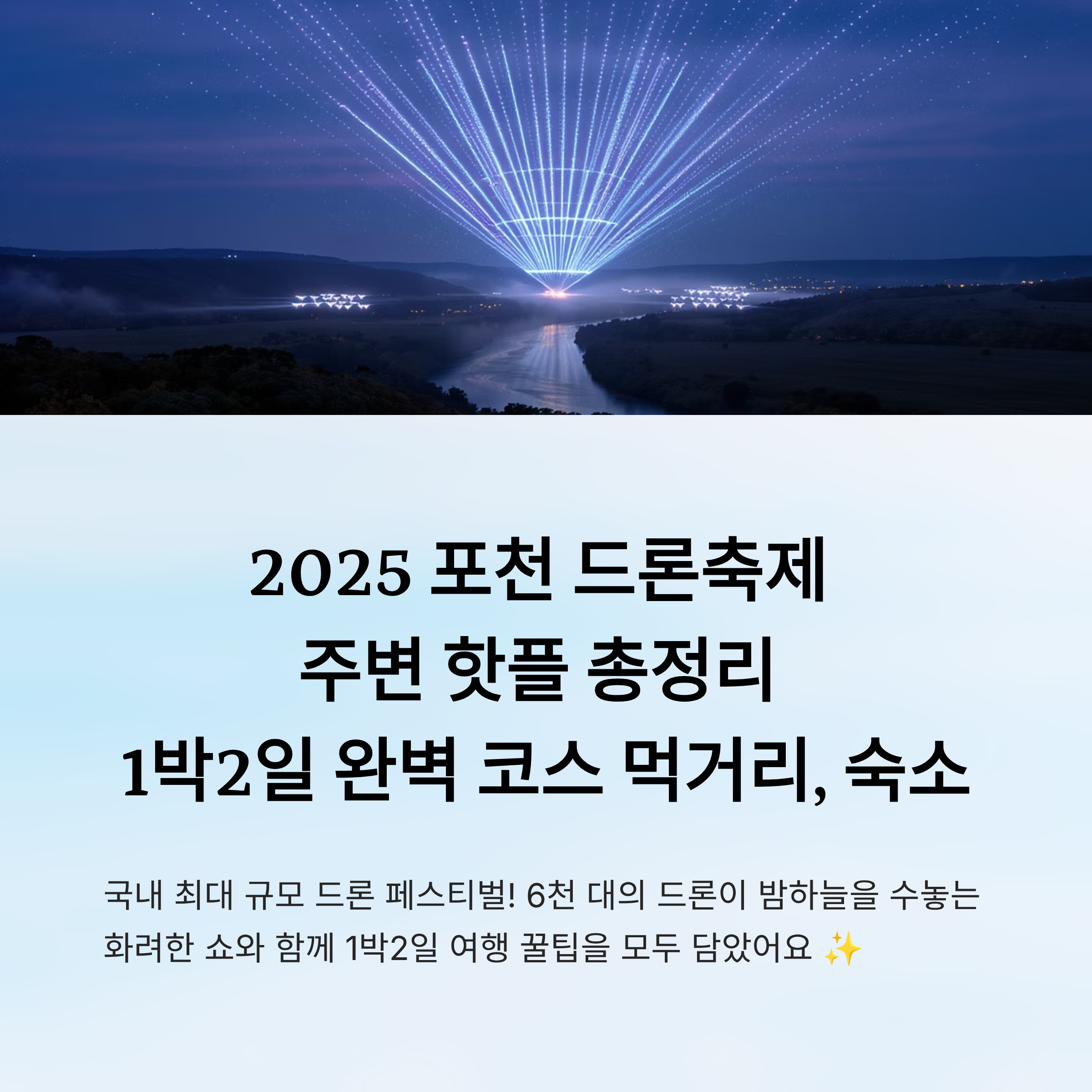 그런데 단순히 축제만 보고 오는 건 아쉽지 않나요? 그래서 준비했어요! 드론쇼부터 맛집, 숙소, 관광 코스까지 포천 1박2일 여행을 꽉 채울 수 있는 꿀팁 총정리! 나만 알고 싶은 정보도 듬뿍 담았답니다 😉