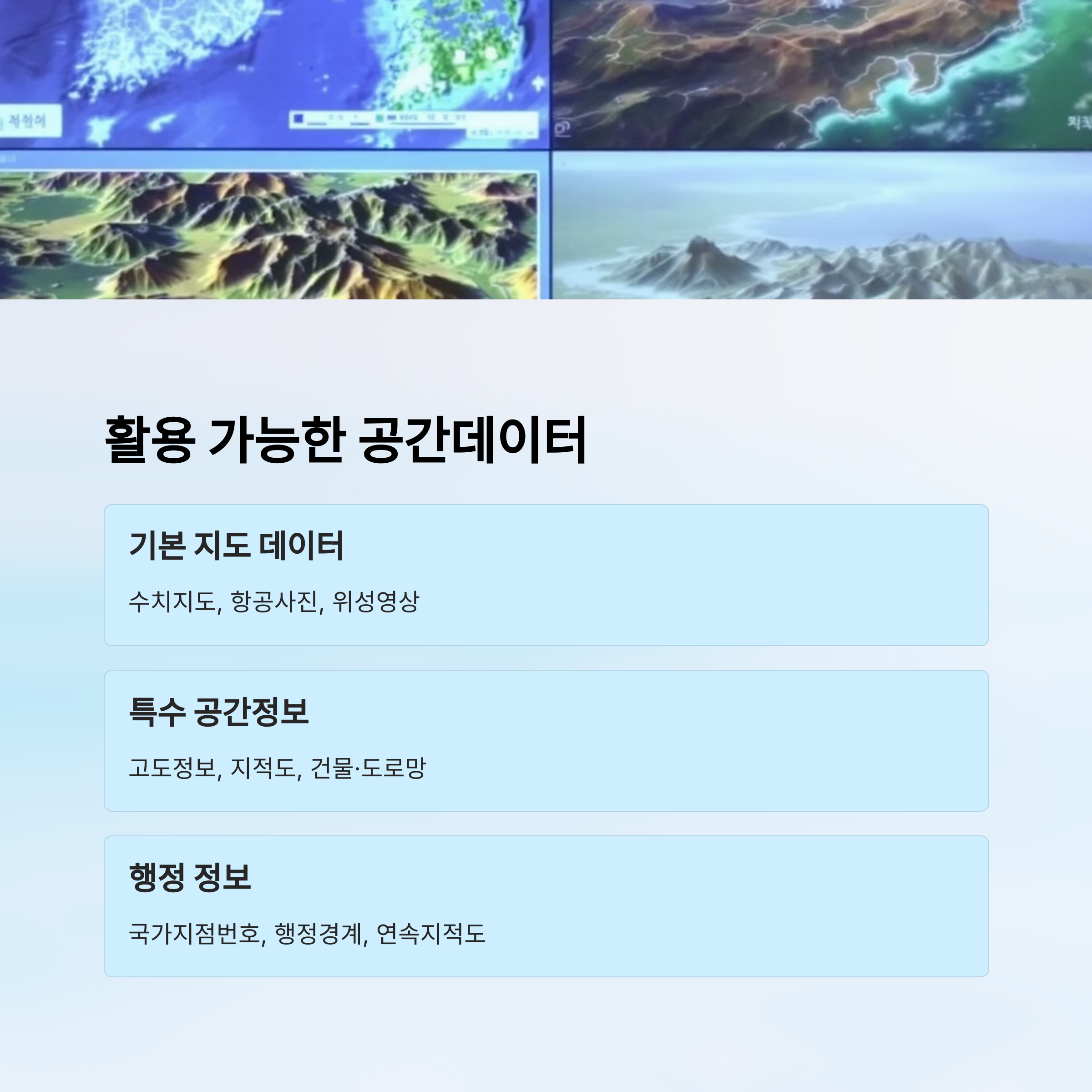 그 외에도 항공사진(정사영상), 디지털 지형도, 고도자료(DEM), 3D 공간정보 등은 도시계획, 환경영향평가, 재난관리 등 다양한 분야에서 핵심적으로 사용돼요. 데이터의 해상도와 갱신 주기가 정기적으로 관리돼 있어서 신뢰도도 매우 높아요.