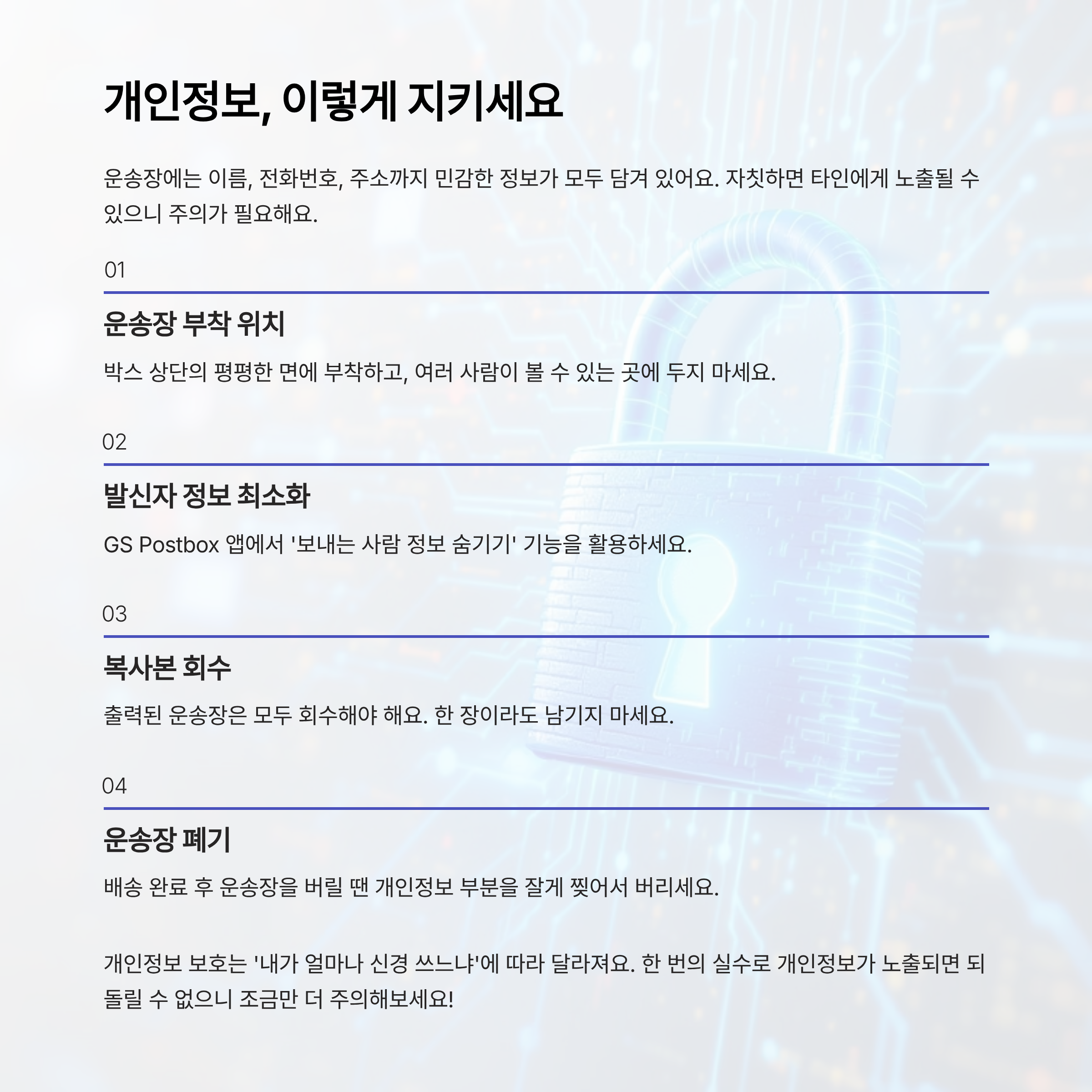 GS편의점 택배를 이용하면서 가장 많이 간과하는 게 바로 개인정보 보호예요. 운송장에는 이름, 전화번호, 주소까지 민감한 정보가 모두 담겨 있기 때문에 자칫하면 타인에게 노출될 수 있어요. 하지만 몇 가지 방법만 지키면 내 정보를 안전하게 지킬 수 있답니다.