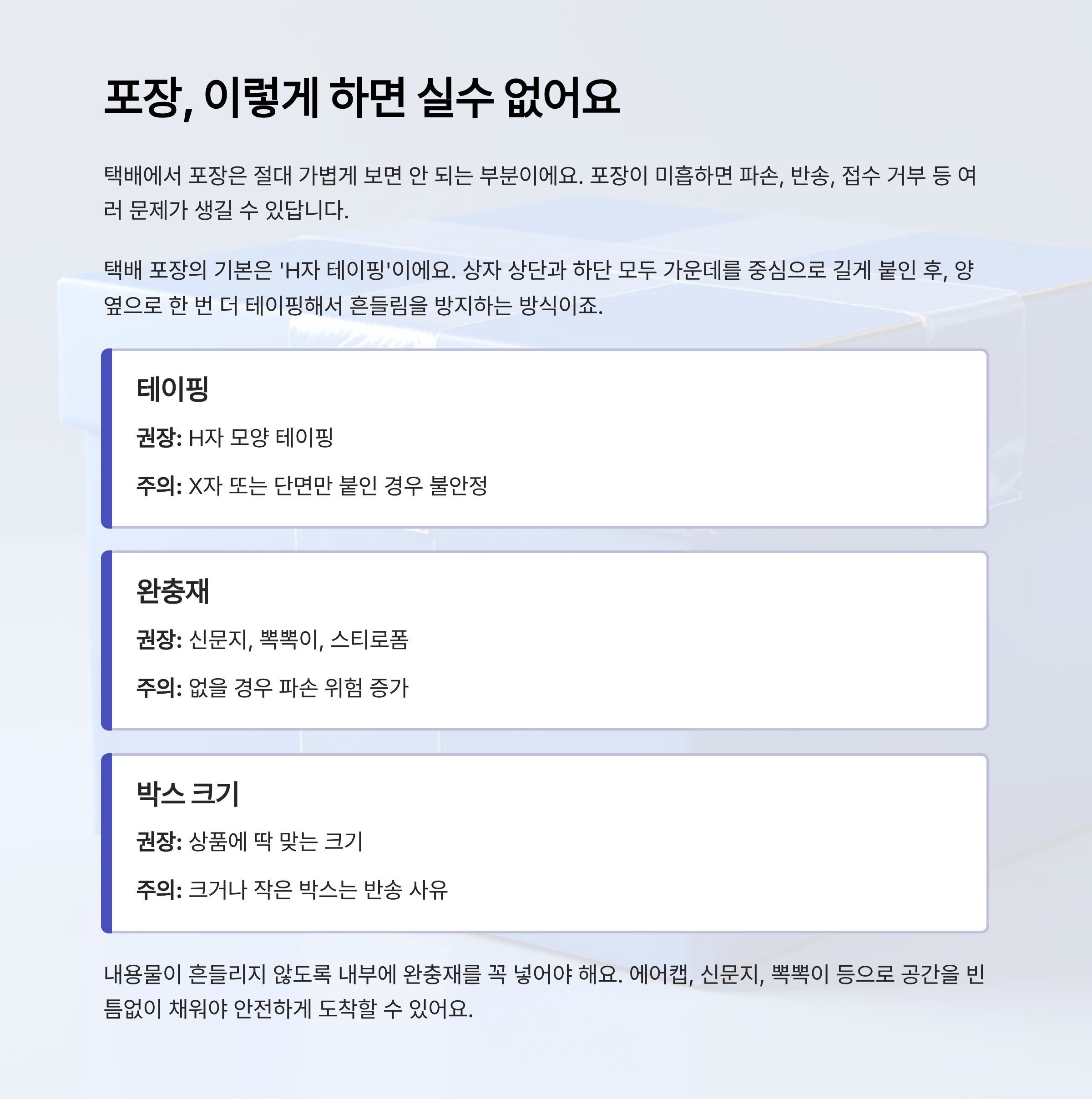 | 완충재 | 신문지, 뽁뽁이, 스티로폼 | 없을 경우 파손 위험 ↑ |