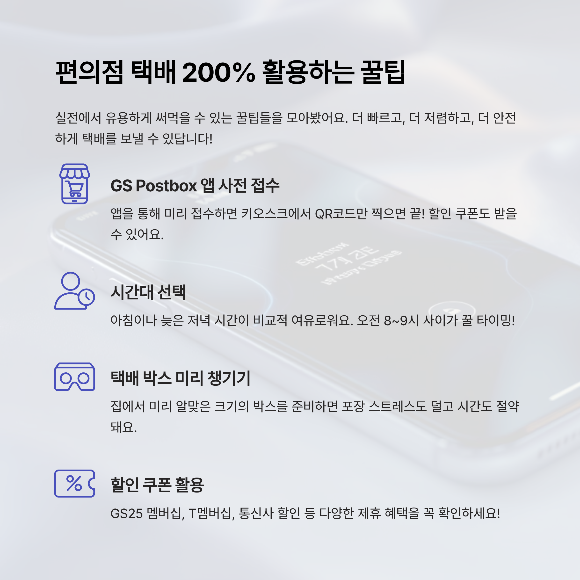 첫 번째 팁은 GS Postbox 앱 사전 접수예요. 앱을 통해 미리 접수하면 키오스크에서 QR코드만 찍으면 끝이라, 정말 빠르고 편해요. 게다가 모바일 접수 시 종종 할인 쿠폰도 받을 수 있어서 요금도 절약된답니다.
